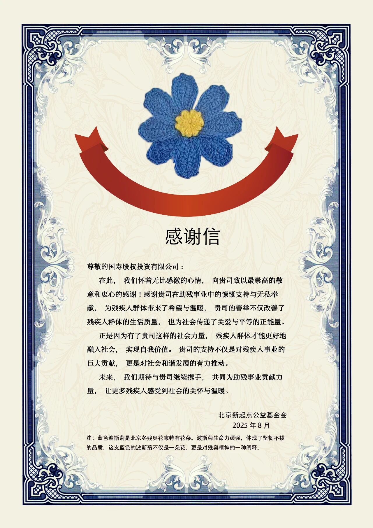 温暖,从来不是单向的给予,而是在彼此照亮中看见更多可能。从参与伤友们的生活重建,到共赴博物馆的文化之约;从助力“美丽工坊”走进商务写字楼,到携手投资企业的多方共建,在践行公益的道路上,我们始终步履不停。自2022年8月8日设立“社会责任日”以来,国寿股权通过成立“志愿服务队”、设立“员工公益教育基地”等方式,将公益深植于企业发展脉络。截至目前,公司已联合北京新起点公益基金会开展近20场公益活动,累计触达近1000人次,员工年参与率达100%。这些数字背后,是真诚的相遇与深厚的情谊。