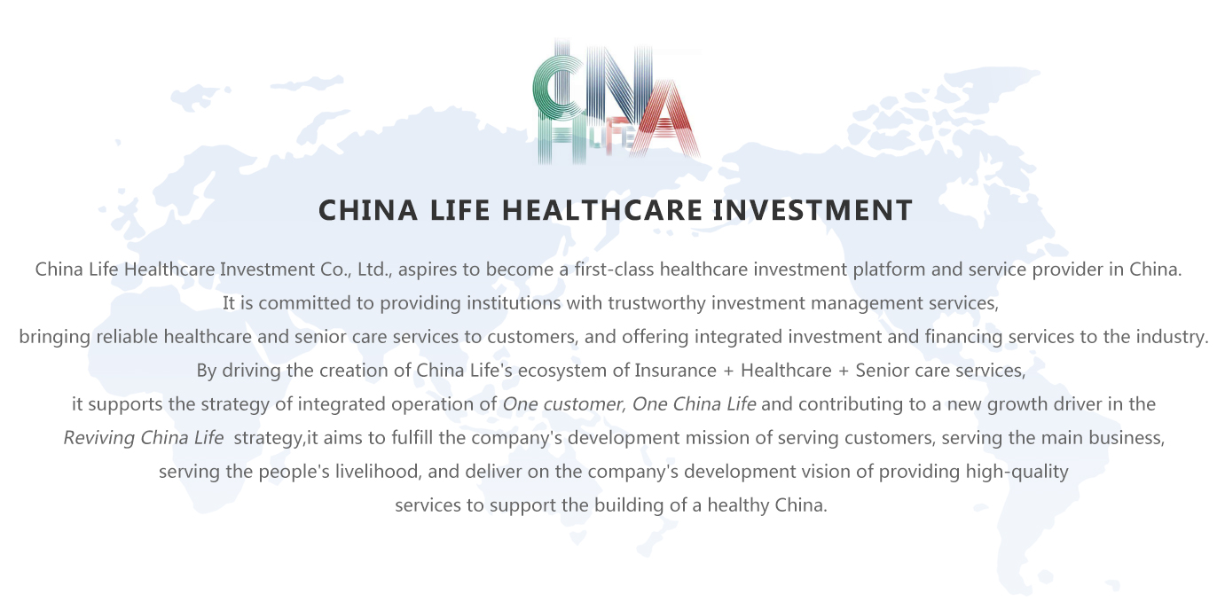 China Life Healthcare Investment Co., Ltd., aspires to become a first-class healthcare investment platform and service provider in China. It is committed to providing institutions with trustworthy investment management services, bringing reliable healthcare and senior care services to customers, and offering integrated investment and financing services to the industry.By driving the creation of China Life's ecosystem of Insurance + Healthcare + Senior care services, it supports the strategy of integrated operation of